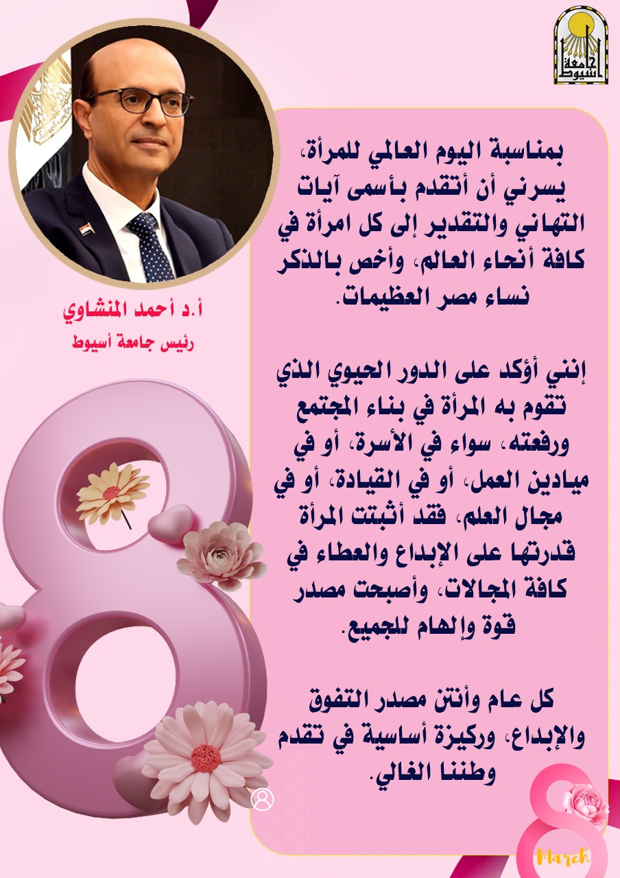 وجه الدكتور أحمد المنشاوي، رئيس جامعة أسيوط، أسمى آيات التهاني والتقدير إلى المرأة المصرية بمناسبة هذه المناسبة العظيمة، وذلك في إطار احتفالات اليوم العالمي للمرأة، الذي يوافق 8 مارس من كل عام.